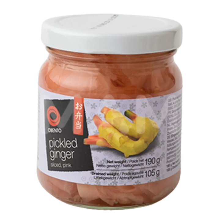 Obento Pickled Ginger ist ein klassischer, rosa eingelegter Ingwer, der sich perfekt als Beilage zu Sushi, asiatischen Gerichten oder Salaten eignet. Mit seiner erfrischenden, leicht süßlichen und mild säuerlichen Note sorgt er für eine geschmackliche Abwechslung zwischen verschiedenen Bissen. Hergestellt aus hochwertigem Ingwer und traditionell eingelegt.